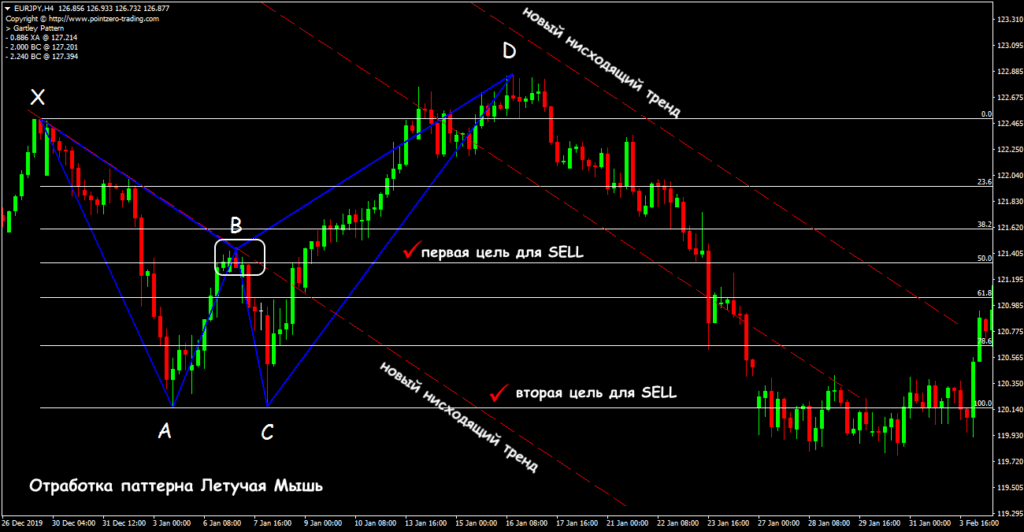 Сигнал для открытия позиции появляется в тот момент, когда на графике видно сформированный гармонический паттерн «Летучая мышь» или Гартли. Для того, чтобы подтвердить качество данного паттерна трейдер должен рассматривать вход в рынок только в момент формирования полного паттерна, т. е. возникновения точки D. Во время создания точки D предполагается, что движение тренда по направлению, обозначенному отрезком XA, будет продолжаться. То есть в случае появления медвежьего паттерна открываем сделки только на продажу, бычьего — на покупки.