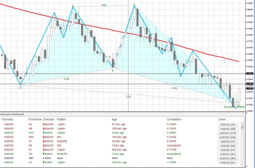 Индикаторы Harmonic Panel решают эту проблему, используя код, позволяющий алгоритмизировать поиск гармонических паттернов на всех таймфреймах и инструментах, доступных в MT4.