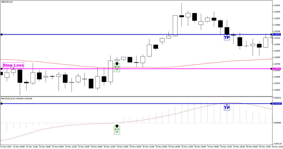 Сигнал входа в длинную позицию (сигнал покупки) появляется, когда на графике H4 цена находится выше среднего EMA 200, а MACD генерирует сигнал для открытия длинной позиции, выраженный тем, что линия MACD пересекает сигнальную линию снизу вверх.