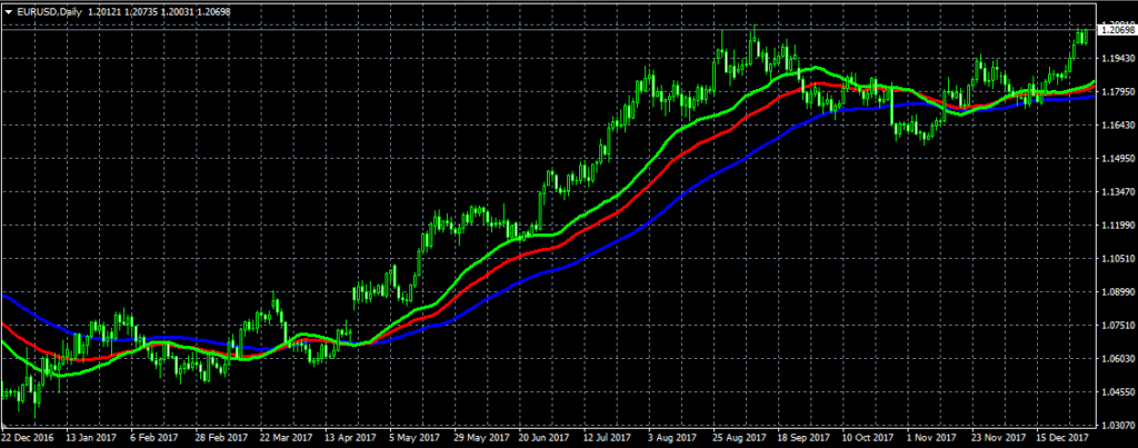 Когда цена поднимается выше трёх линий – тренд сменяется на восходящий. Когда цена опускается ниже всех трёх линий – тренд сменяется на нисходящий.