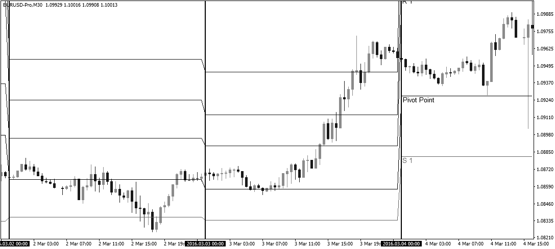 Обратите внимание, что уровни разворота каждого торгового дня выстраиваются по-разному. Это происходит потому, что каждый торговый день имеет разные дневные максимумы, минимумы и значения закрытия