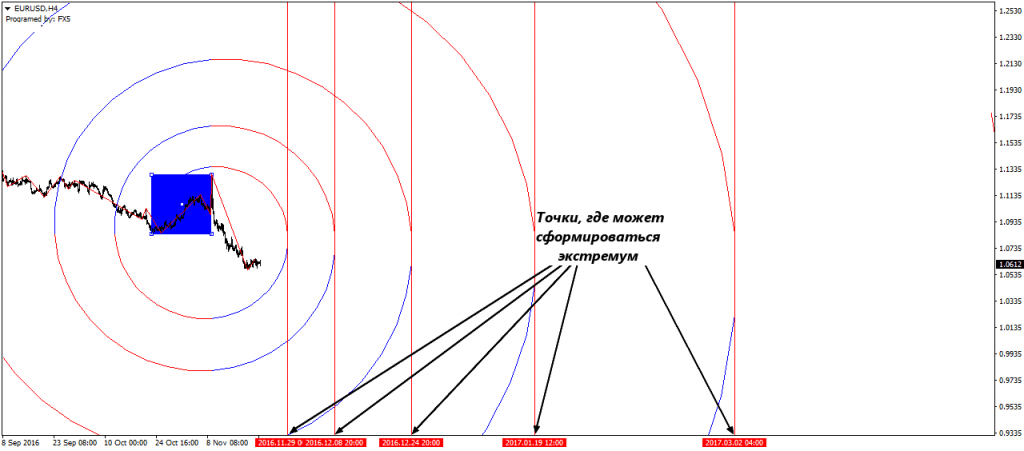 Вышеописанный алгоритм FX5_FiboSpiral успешно используется для выявления на рабочем графике потенциально значимых точек, в которых, как ожидается, может появиться локальный ценовой экстремум. Иными словами, для этого индикатора в данном случае действует принцип, аналогичный тому, который обычно применяется при определении временных зон на рабочем графике (рисунок 7).