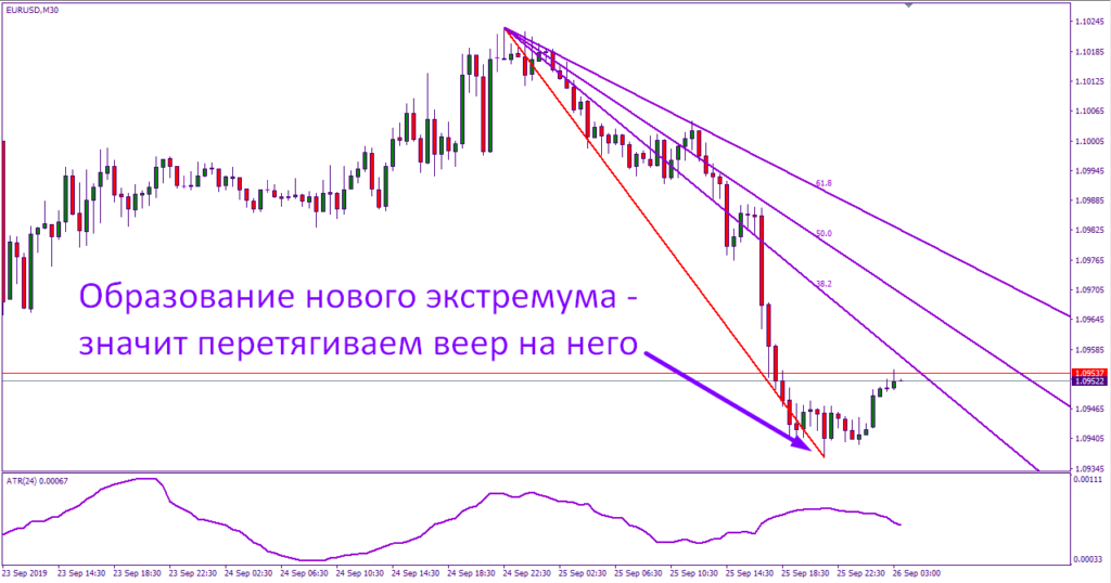 Теперь, одно из железного правила этого инструмента; при обновлении минимума при нисходящем движении, нижнюю точку базовой линии веера необходимо перестроить на вновь сформировавшийся экстремум. Абсолютно верное утверждение будет и в обратном случае; при восходящей тенденции, верхнюю точку базовой линии веера, также следует перетягивать на обновлённый максимальный экстремум. Давайте Друзья посмотрим на последовательность вееростроения: