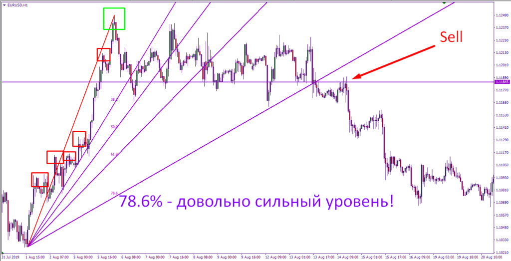 Значит, смотрите, по мере продвижения цены по восходящей тенденции мы много раз перестраивали базовую линию веера (максимумы выделены красными прямоугольниками). Несомненно, мы там могли много раз потерять часть от лимита средств на день или на депозит (в зависимости вашего манименеджмента). А также, могли много заработать – давайте в приоритете держать всё-таки положительные позиции