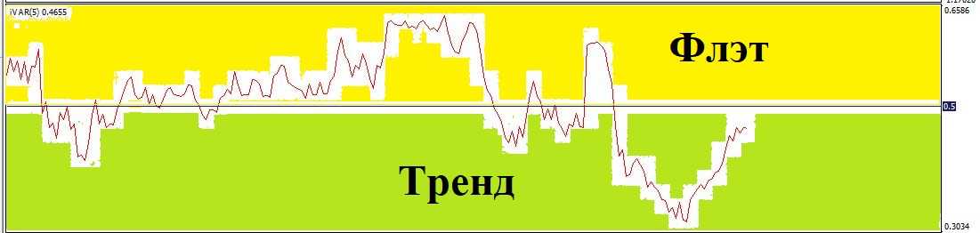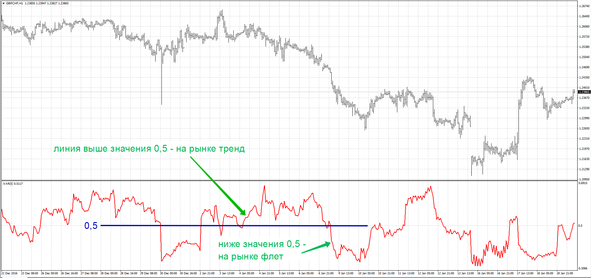 Если значение индикатора больше 0,5 (линия индикатора выше этой отметки) – на рынке присутствует тренд. Если значение ниже 0,5 (линия индикатора ниже этой отметки) – на рынке флет.
