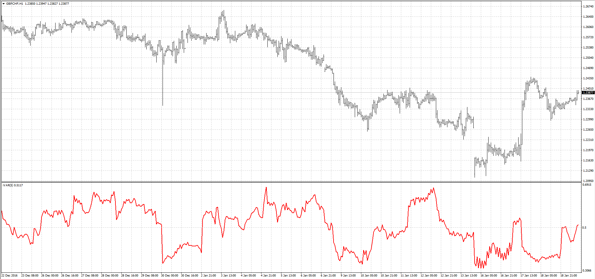 На ценовом графике технический индикатор iVAR размещается в отдельном окне и имеет вид ломаной линии, которая перемещается вверх и вниз относительно уровня 0,5.