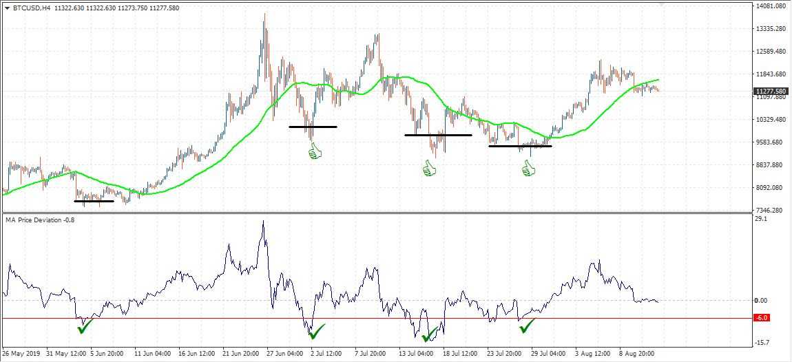 На графике видно, что при отметке индикатора отклонений около -6 % продажи останавливаются и самые смелые покупают дешево. «Price deviation MA» не даст совершить ошибку покупок на хаях.