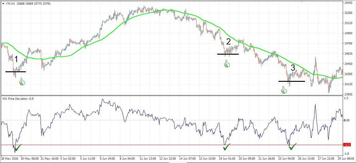 Проведу аналогию с покупками в магазине. Каждый день на продажу в магазин привозят 3 ящика яблок. При скидке 30% на них от средней цены по городу, все яблоки скупаются у продавца, а при выше средней на 20% никто не покупает. Так «Price deviation MA» показывает, что при дисконте, во сколько % не останется больше товара, или при каком % накрутки уже не найдется покупателей на товар.