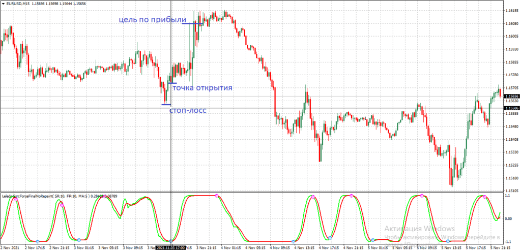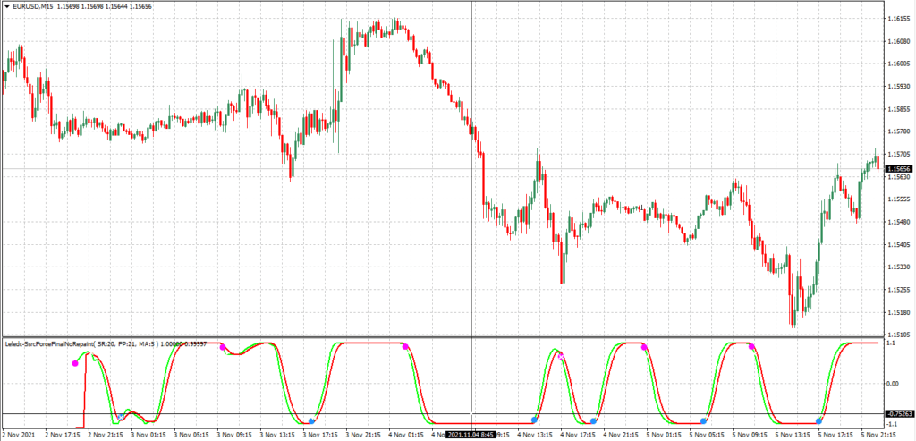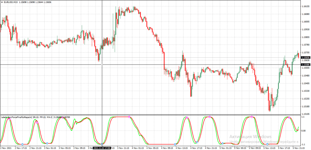 Рисунок 4. Не перерисовывающийся индикатор Leledc SSRC Force.Стратегия трейдинга в этом случае проста – при появлении очередного сигнала надо открыть соответствующую позицию. Закрывается она по СтопЛоссу (находится на ближайшем локальном экстремуме) или при достижении кривыми индикатора без перерисовки SSRC Final (это альтернативное название Leledc Force) противоположного пересыщенного сделками одного типа состояния.