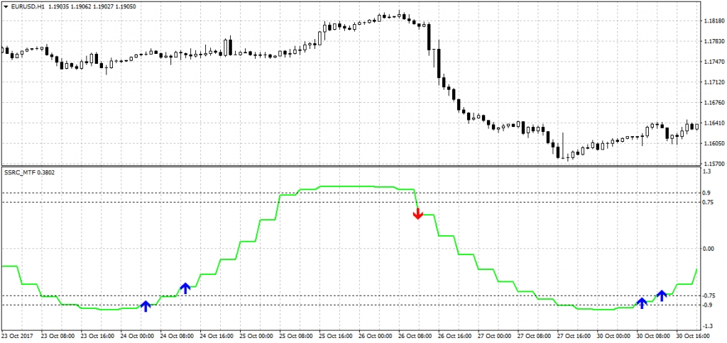 Основные сигналы для оформления сделок приходят в момент пересечения линии SSRC с одним из экстремальных уровней -0,9; 0,9; 0,75, -0,75: