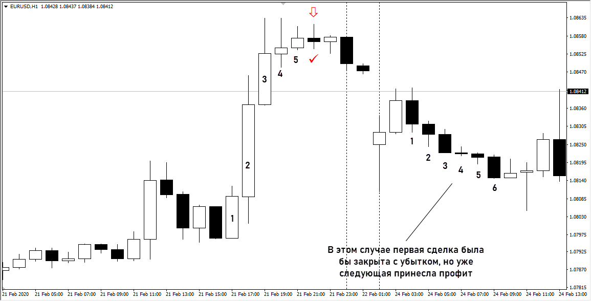 Стратегия называется 5 свечей, но жесткой привязки к числу свечей одного цвета в последовательности нет. Можете подстраховаться и входить в рынок только после 7 или 9 свечей, этим снизите частоту торговли, но повысите винрейт.