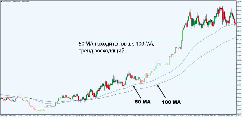 Восходящий тренд — 50 MA находится выше 100 MA.