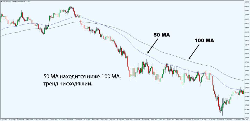 Нисходящий тренд — 50 MA находится ниже 100 MA.