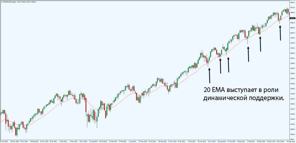 Часто, когда цена находится в сильном восходящем тренде, она не возвращается к предыдущему уровню сопротивления, который превратился в поддержку. Поэтому мы можем использовать скользящие средние для определения динамической поддержки. Это области, где мы будем искать возможные точкив входа.
