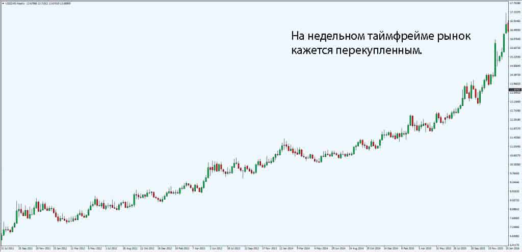 К примеру, на более низком таймфрейме рынок находился возле сопротивления, и у меня появлялся сигнал, чтобы открывать короткую позицию. Но на более высокий таймфрейме рынок казался чрезмерно перекупленным и, скорее всего, должен был случиться откат.