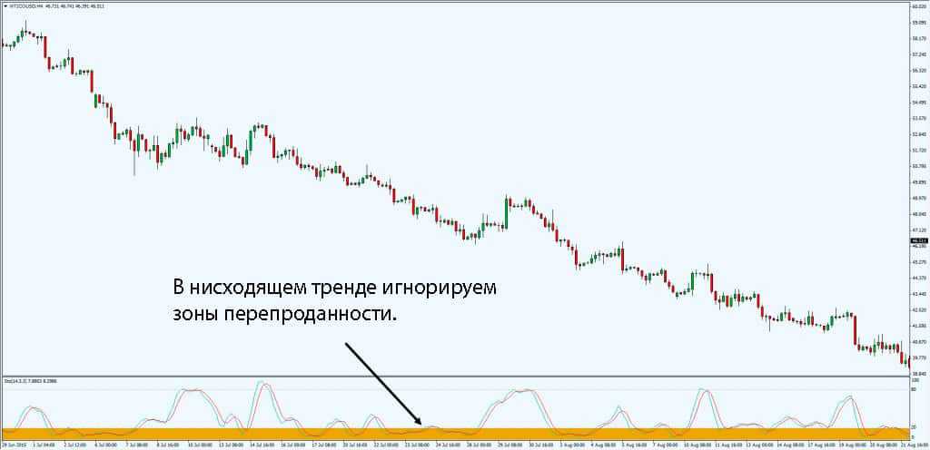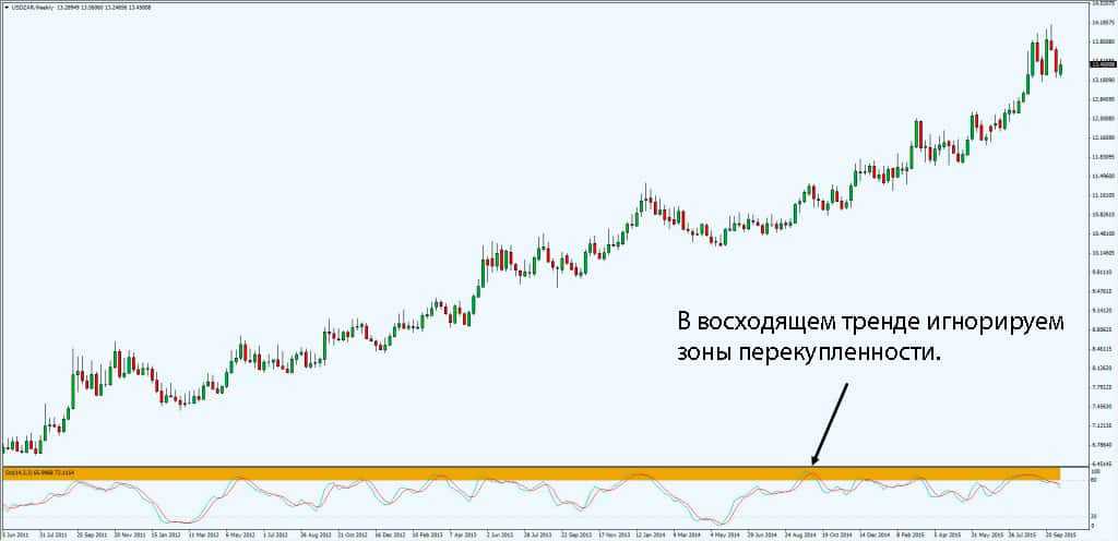 В восходящем тренде мы игнорируем зоны перекупленности, так как, скорее всего, цена будет двигаться выше. В нисходящем тренде мы игнорируем зоны перепроданности, так как, скорее всего, цена пойдет ниже.