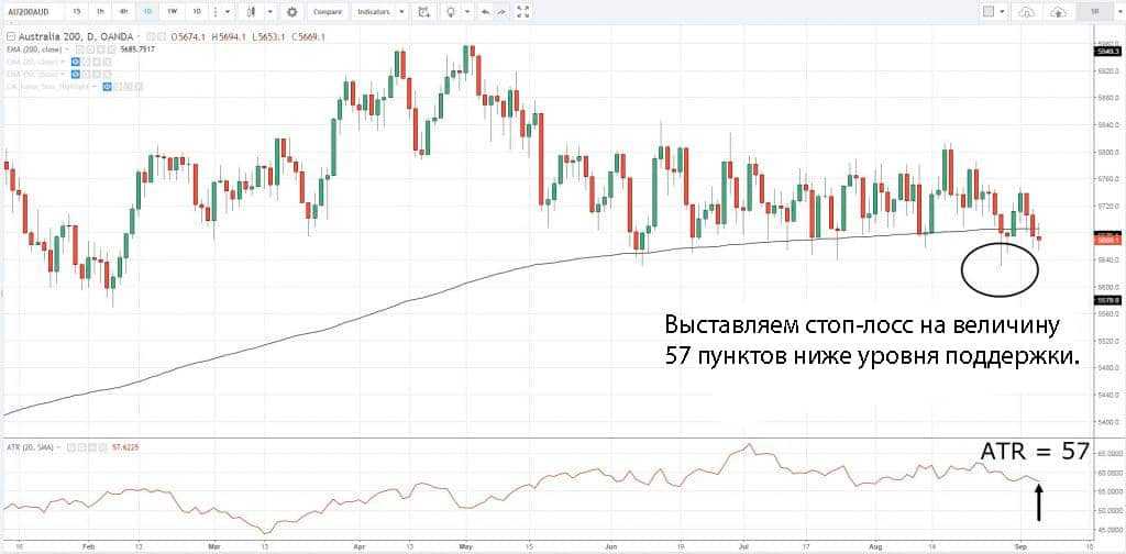 Индикатор ATR измеряет волатильность рынка, и мы можем использовать его для установки стоп-лосса. Прибавляем текущее значение ATR к цене входа и умножаем его на множитель (1 или 2).