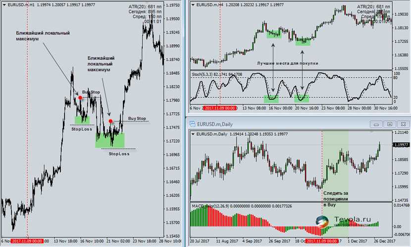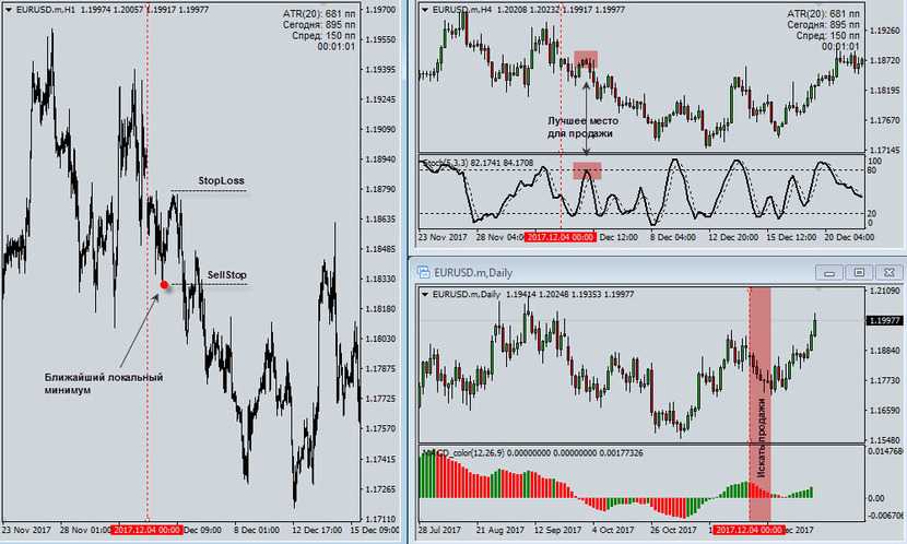 В заключении хотелось бы показать два примера, как Форекс стратегия три экрана отрабатывается на рынке Форекс. Для простоты восприятия, все три экрана, постарался максимально сжать и отобразить одним скрином. В первом случае представлен пример сделки в покупку, во втором случае пример сделки на продажу.