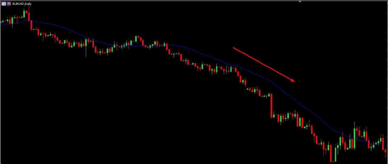 2-й способ – наклон MA. Этот метод основан на определении тренда по наклону скользящей средней. Если MA наклонена вниз, то тренд нисходящий, а если вверх, тренд восходящий.