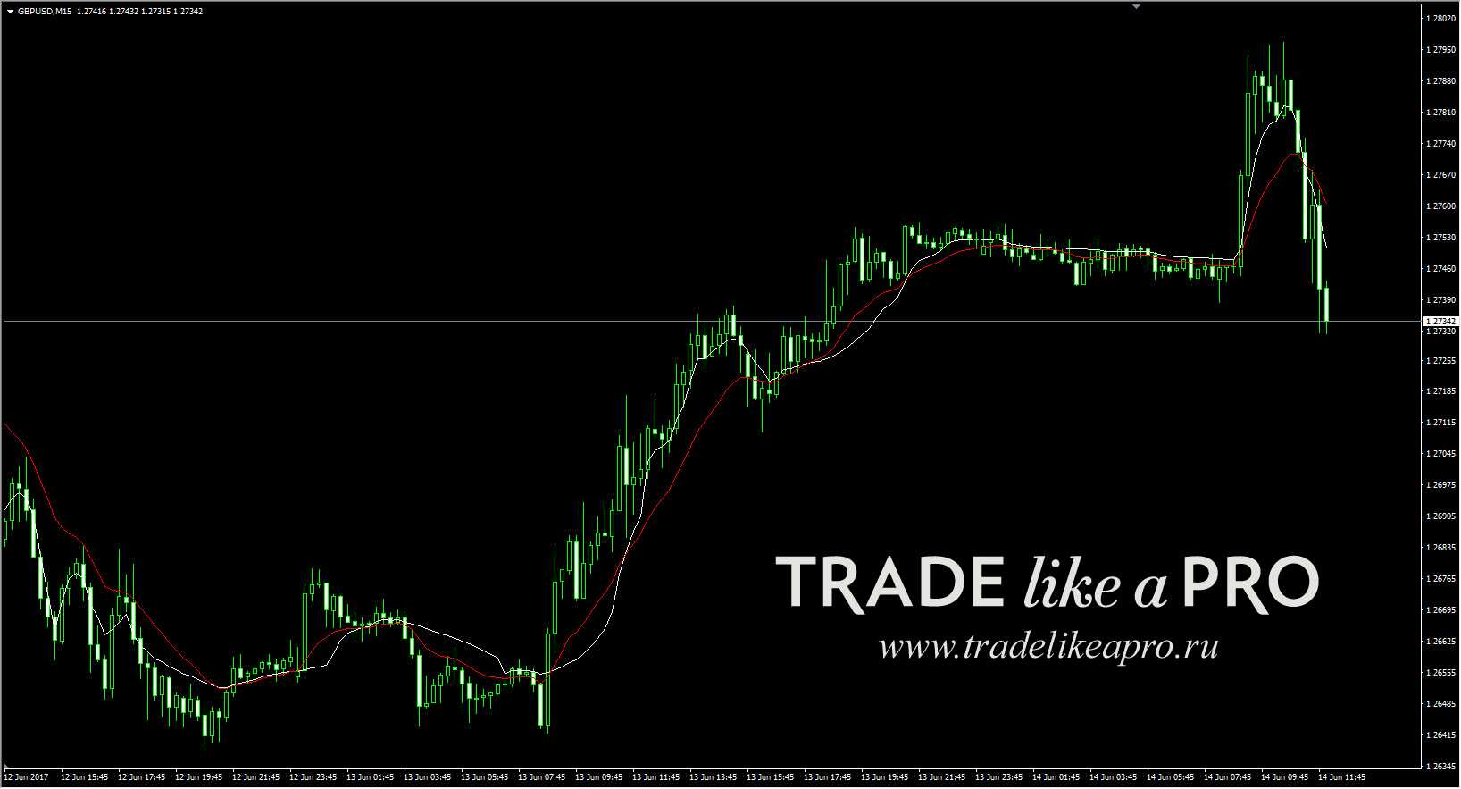 Обратите внимание, что торговые сигналы желтая линия отображает более корректно в силу усовершенствованного алгоритма расчета. Ложные пробои красной скользящей случаются значительно чаще