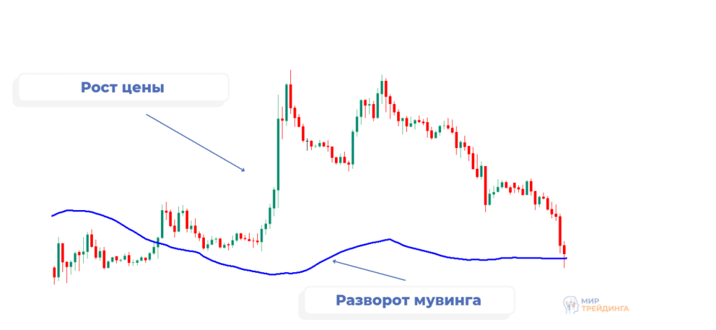 - МА обладает свойством запаздывания. Проще говоря, для изменения наклона и текущего значения требуется не одна свеча. Подвижность зависит от установленного периода мувинга. Чем он больше, тем медленнее двигается линия. Если происходит быстрый разворот, то цена может уйти достаточно далеко прежде, чем развернется линия индикатора.