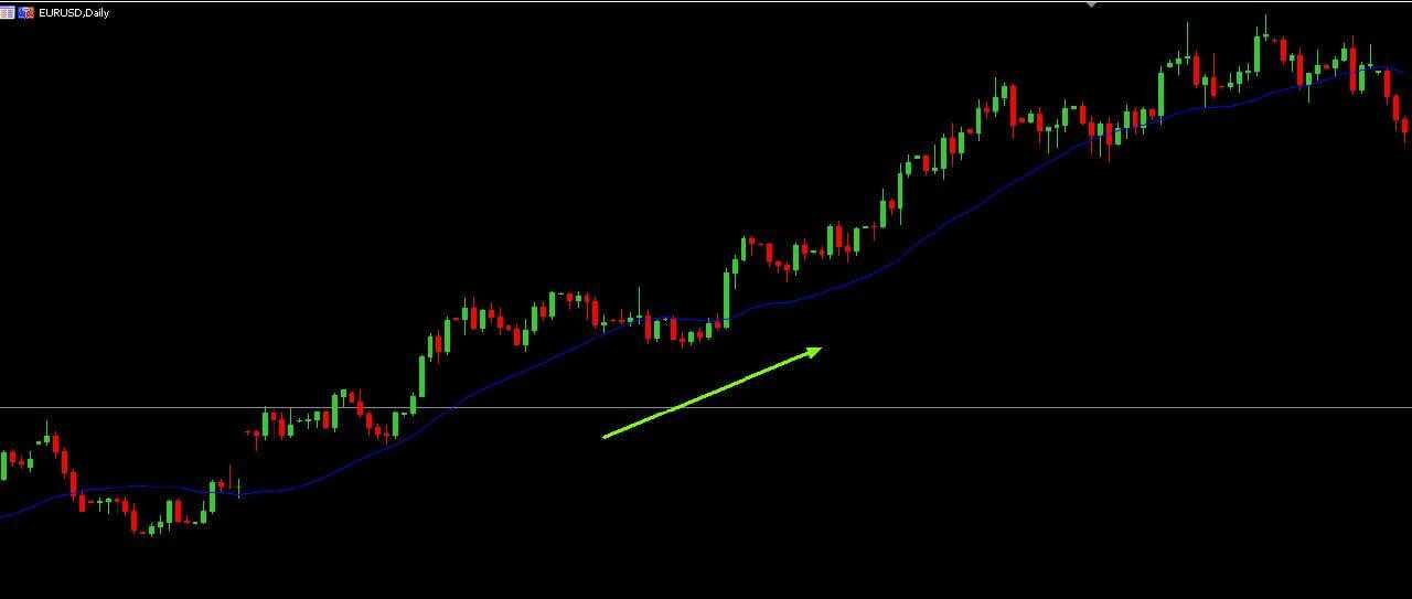 Чтобы определить направление тренда используют SMA или EMA различных временных периодов. Например, SMA 100 на рынке EURUSD для часового периода отчетливо показывает растущий тренд и выглядит следующим образом