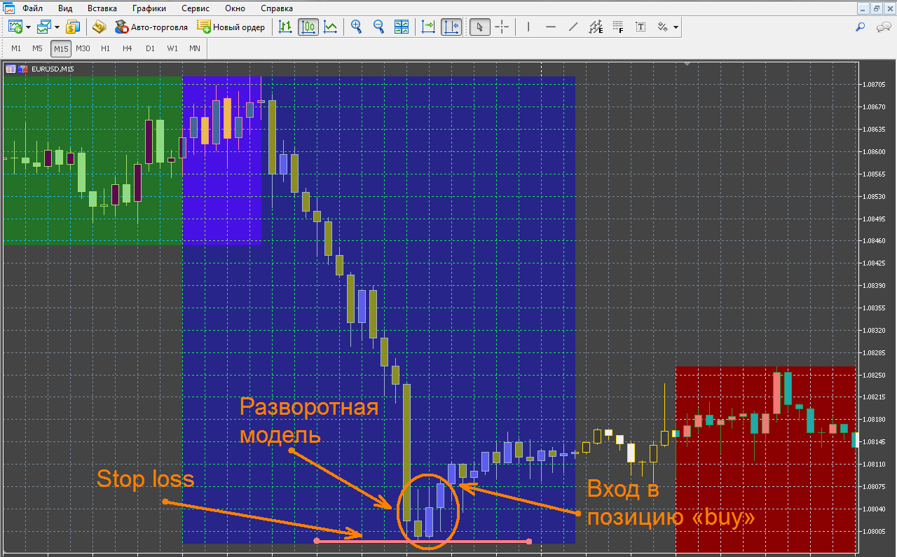 - Ордера «stop loss» для показанных в пункте 4 двух вариантов входов.