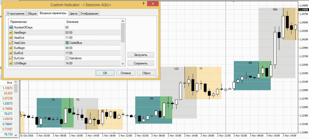 - Интересная особенность индикатора – здесь можно самостоятельно указать время начала и окончания торгов. Поэтому если трейдеру удобно задать собственные часы, он может всегда сделать это.