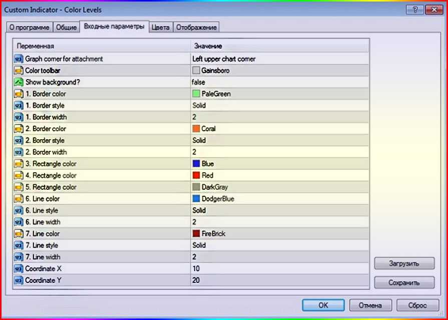 Данный инструмент позволяет задавать около двух десятков входных параметров, преимущественно отвечающих за графическое отображение фигур. В принципе, ни на какие технические особенности они не влияют – можно даже оставить стандартный набор по умолчанию, сделаны опции скорее для тех, кто хочет сделать свою работу максимально комфортной и исключить вероятность запутаться в показаниях индикатора.