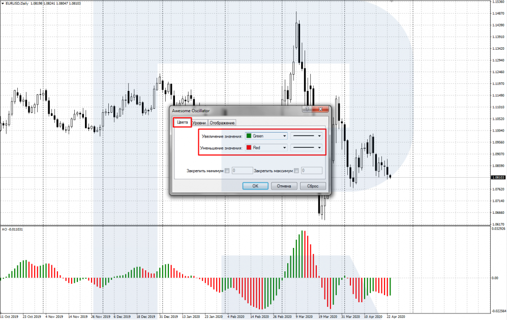 При установке индикатора Awesome Oscillator в окне настройки можно задавать цвета и толщину для растущих и снижающихся столбиков гистограммы. Остальные параметры заданы по умолчанию и не меняются.