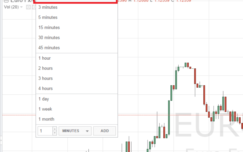 Вы сразу же получите котировочный график искомого актива, и на нем вам нужно установить для таймфрейма 1-минутное значение:
