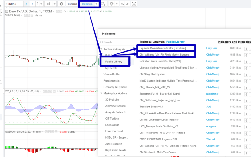 Плюс в библиотеке индикаторов через соответствующую кнопку выбрать лучшие, без перерисовки. Ими, в указанной стратегии, будут: Squeeze Momentum Indicator вместе с CM Williams Vix Fix – и они действительно лучшие потому, что в пользовательском рейтинге занимают первые места: