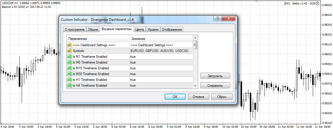 Откроется окно с настройками индикатора. Функциональные изменения можно внести во вкладке «Входные параметры»: добавить или удалить валютную пару, включить или выключить поддержку какого-то конкретного таймфрейма и т. д. По умолчанию инструмент анализирует все таймфреймы на основных валютных парах.