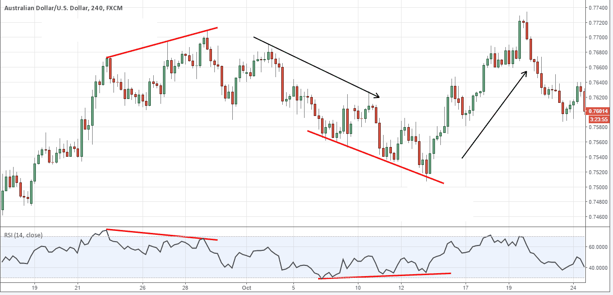 Скрытая дивергенция на форекс вниз. Скрытая модель указывает на продолжение тенденции, а не его разворот.