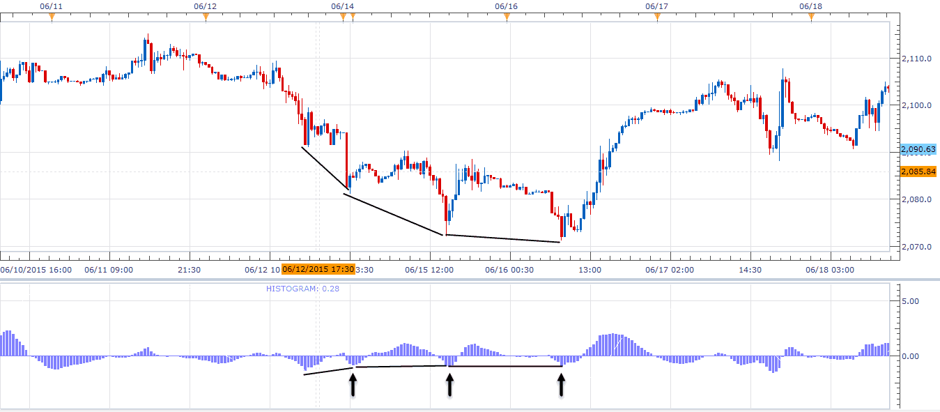 В случае с MACD, дивергенция определяется между направлениями цены и последовательно повышающимися или понижающимися столбиками гистограммы
