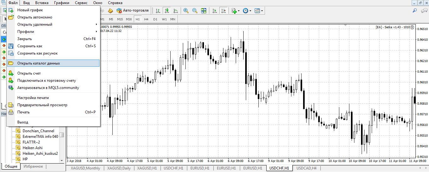 Для начала необходимо открыть каталог данных терминала. Сделать это можно либо через папку торговой платформы на жестком диске, либо через вкладку «Файл» на главной панели.
