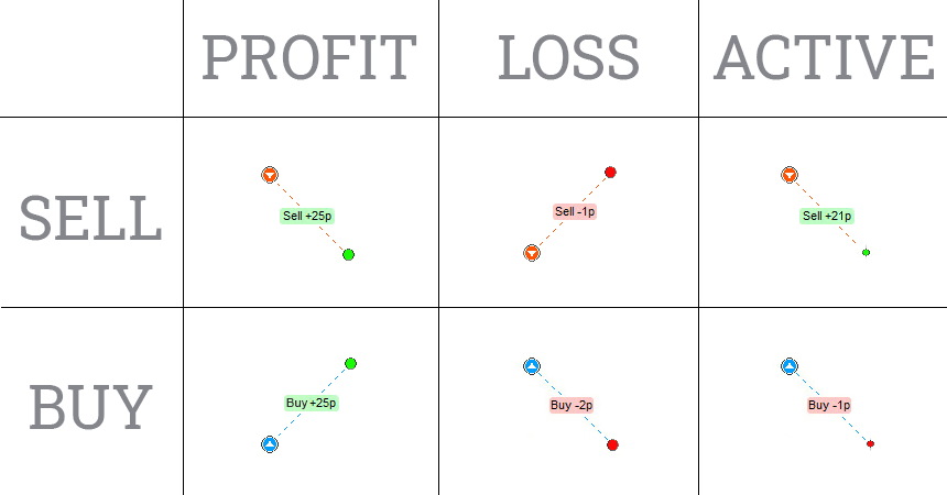 Также показаны и убыточные сделки, они выделены красным цветом и указывают на убыток в размере – 23p и -19p.
