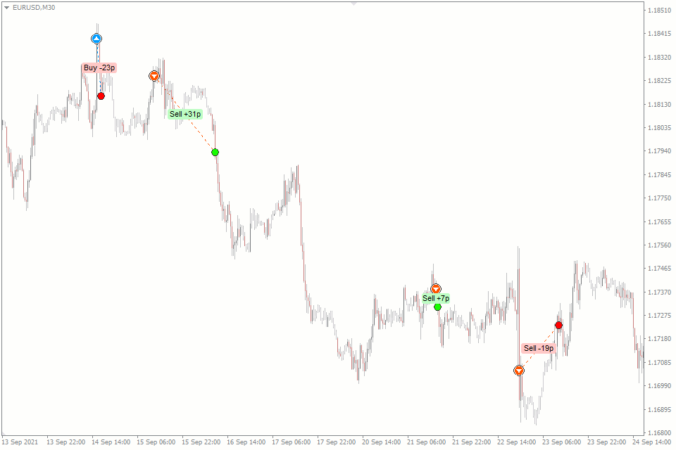 - Показывает результат сделок в пунктах или валюте счета непосредственно на графике;