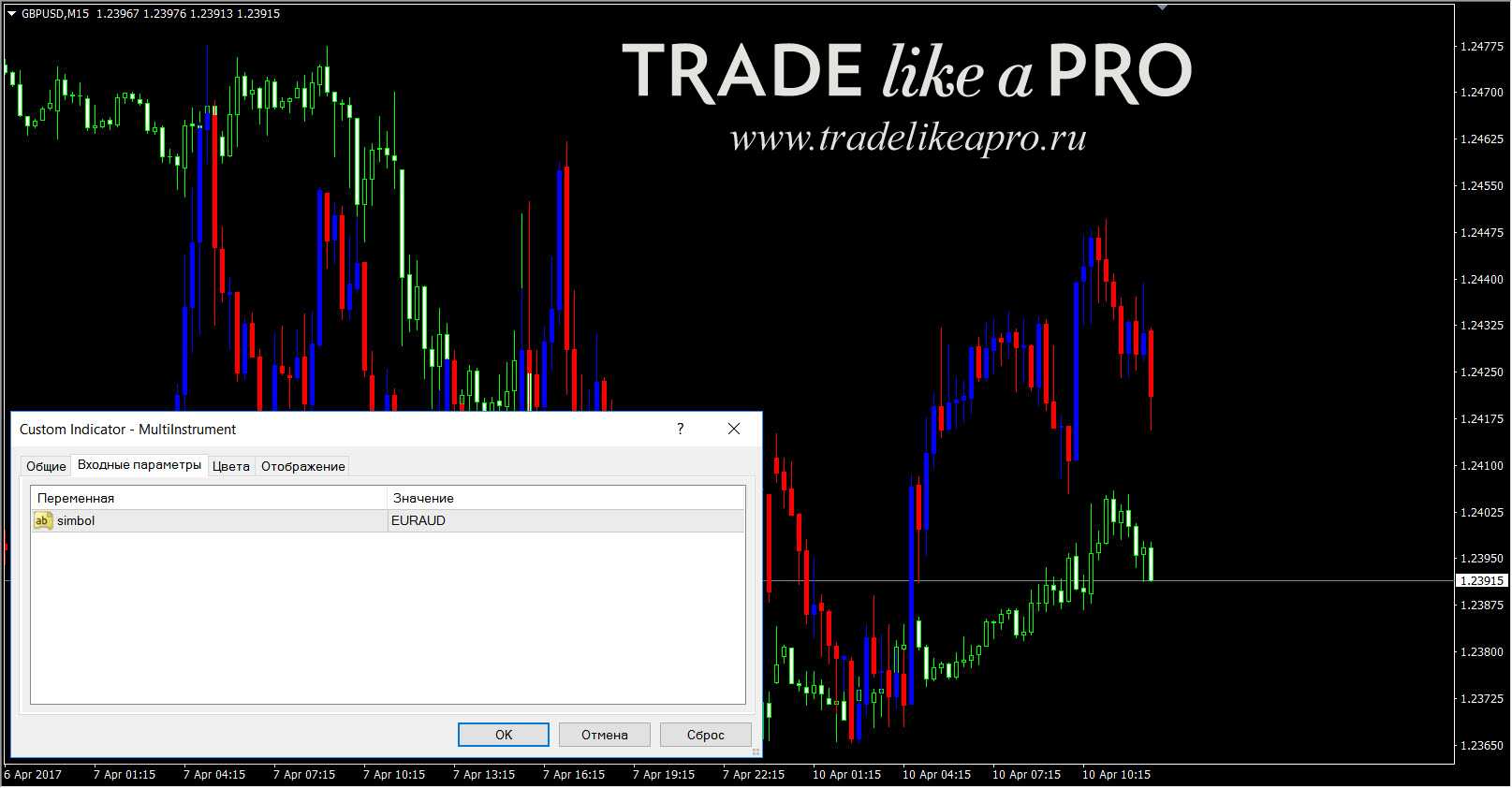 MultiInstrument – индикатор прямо в окне вашего инструмента покажет график того инструмента, что вы впечатаете в настройках (на примере ниже на графике GBPUSD показана пара EURAUD). Удобно.