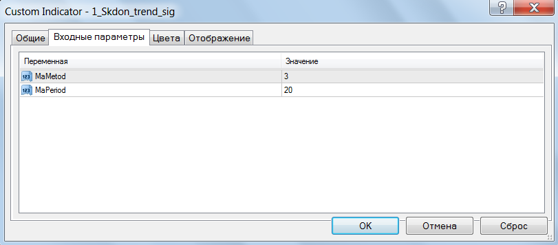 Для каждого индикатора, разработчик создает свои входные параметры. Здесь могут быть перечислены различные, используемые при расчетах индикатора, значения, подключение или отключение той или иной возможности (к примеру, использовать ли Alert?), редактирование цветов линий, используемых в окне Chart и многое другое, что может помочь правильно настроить индикатор.