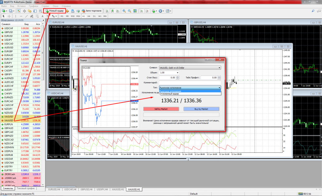 Вы можете разместить мгновенный ордер на платформе MT4, выбрав категорию ордера «Market Execution».