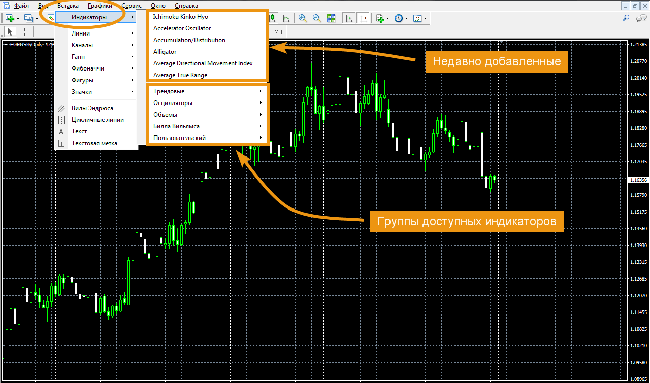 В торговой платформе изначально уже встроен довольно широкий перечень алгоритмов, список которых можно увидеть в «Навигаторе» (открывается при нажатии на соответствующую иконку в верхней части терминала), либо выбрав соответствующий пункт в верхнем меню («Вставка» — «Индикаторы»).