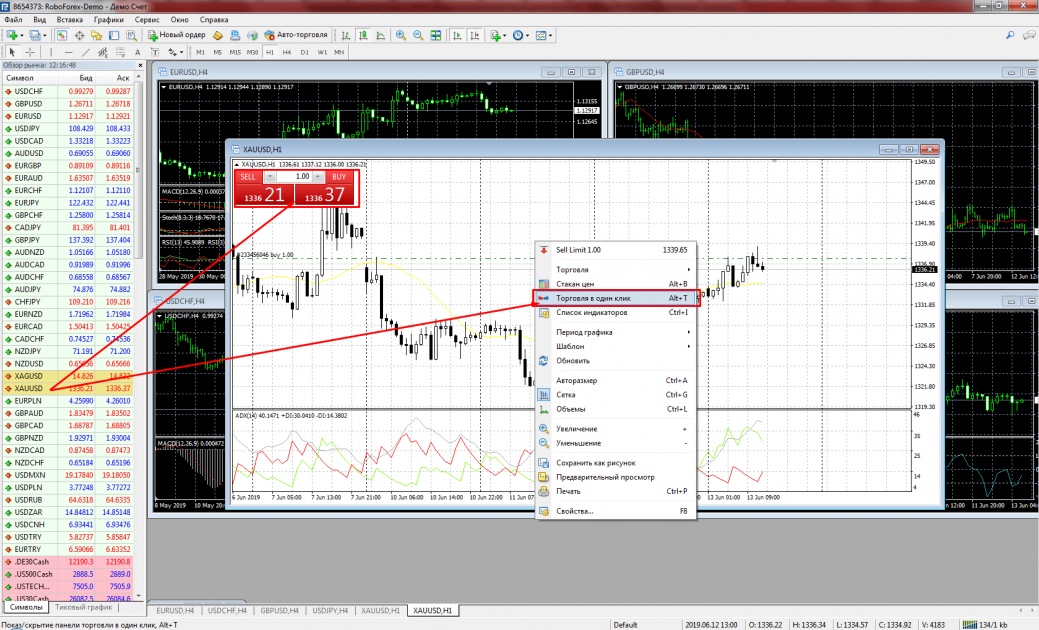 Также для открытия сделки можно вывести на график окно «Торговля в один клик». Для этого в поле графике нужно нажать правую клавишу мыши и выбрать «Торговля в один клик» (Alt+T). В этом окне можно быстро задавать объем ордера и входить в покупку или продажу инструмента по текущей рыночной цене. Слева в окне находится кнопка приказа на продажу (Sell) и текущая цена продажи, справа — кнопка приказа на покупку (Buy) и текущая цена покупки. Нажатие одной из этих кнопок запустит выполнение торгового приказа в выбранном трейдером направлении.