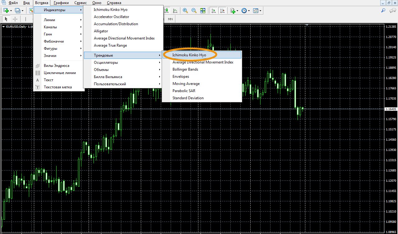 Давайте теперь для примера выберем любой из имеющихся инструментов… Я добавлю «Облако Ишимоку»… Для этого перехожу: «Вставка → Индикаторы → Трендовые → Ichimoku Kinko Hyo» (рис. 2).