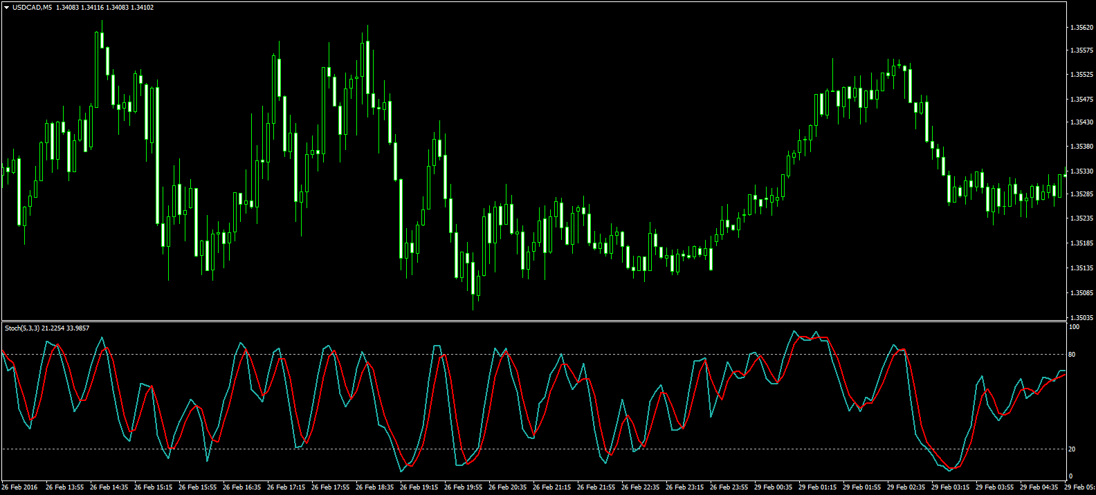 Для стохастика, уровень продажи 80-100, а покупки – 0-20. По выходу из этой зоны совершается сделка продолжительностью 1 минута или 15 минут, если работа ведется на временном интервале М15.