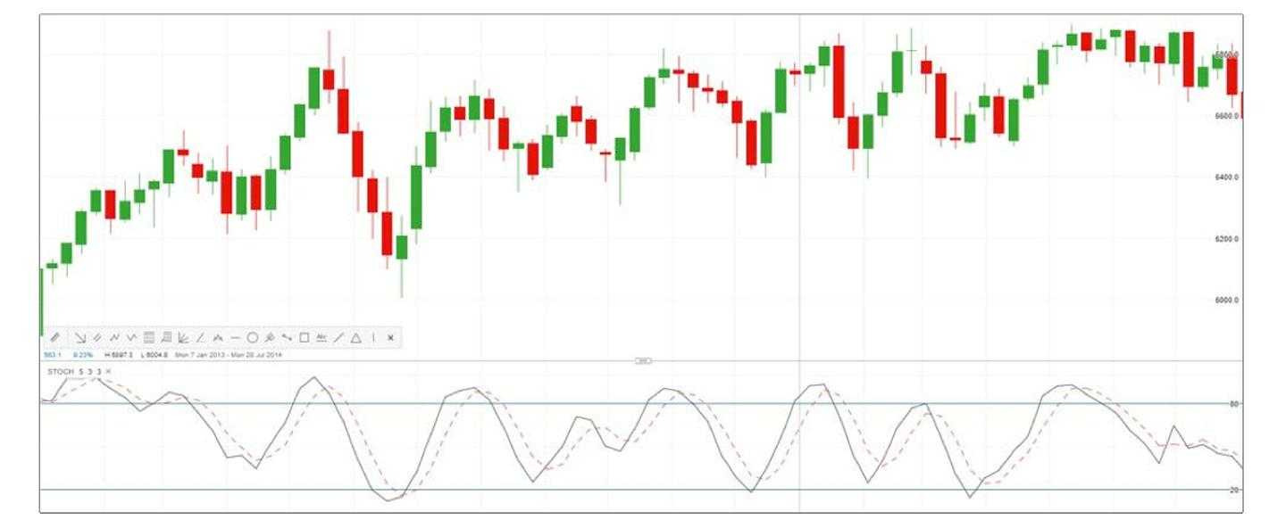 5. В то же время, как свеча закрывается выше сопротивления или ниже уровня поддержки, стохастический осциллятор должен находиться в области перекупа или перепродажи соответственно.
