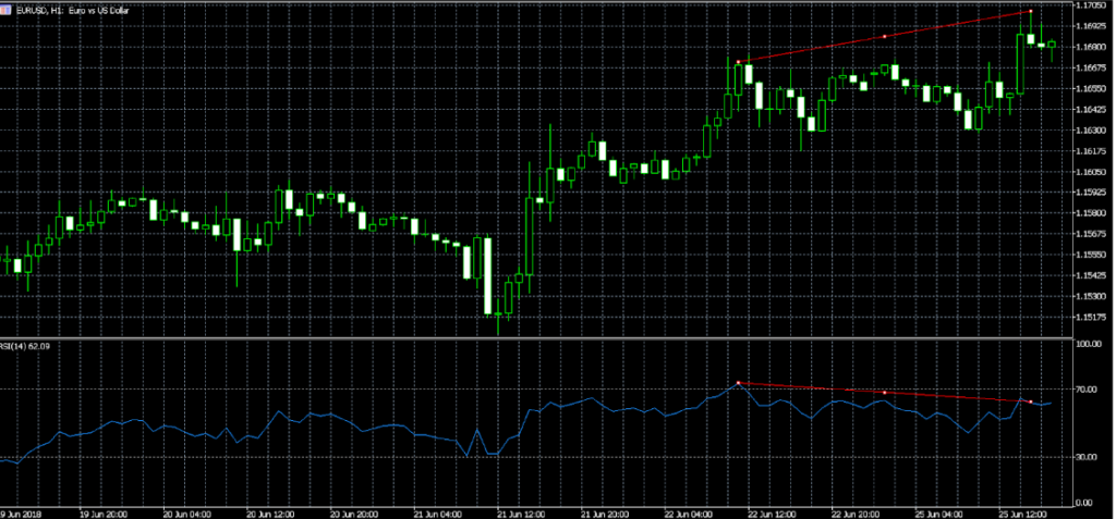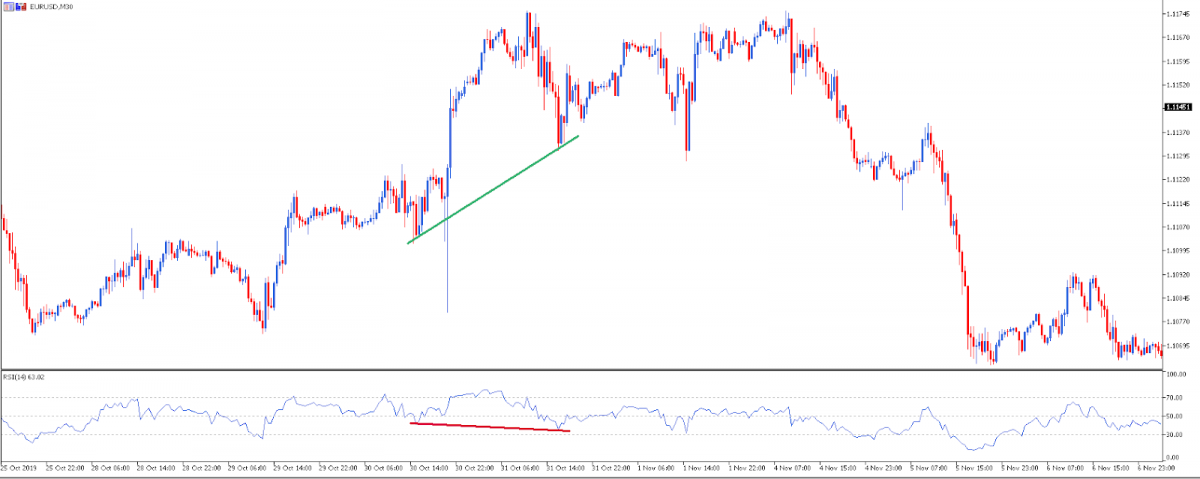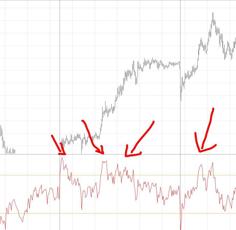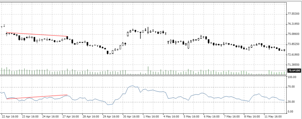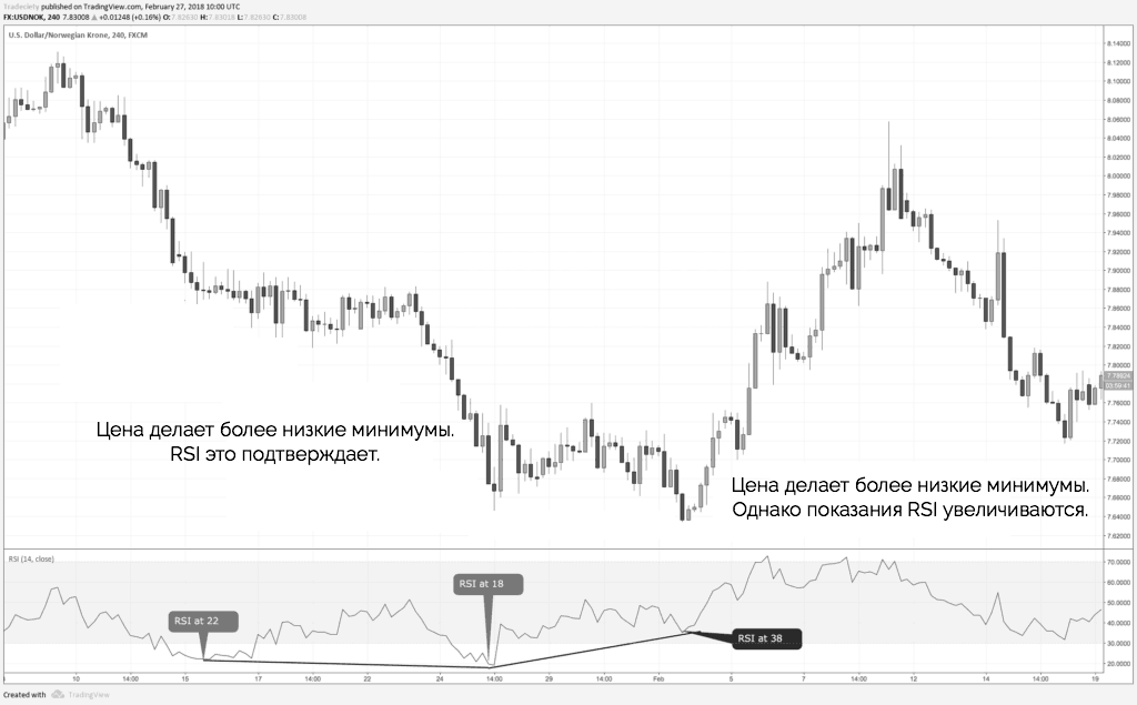 Еще один способ использования индикатора RSI для определения точек разворота цены – поиск дивергенций. Дивергенция означает, что показания цены не соответствует ценовой динамики.