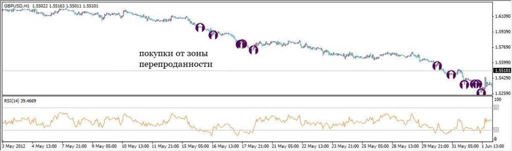 сигналы индикатора RSI (перепроданности и перекупленности)