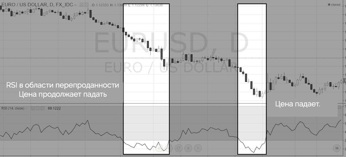 Не доверяйте полностью этому индикатору. Если актив находит у зоны 30 или 70, он не обязательно перекуплен / перепродан.