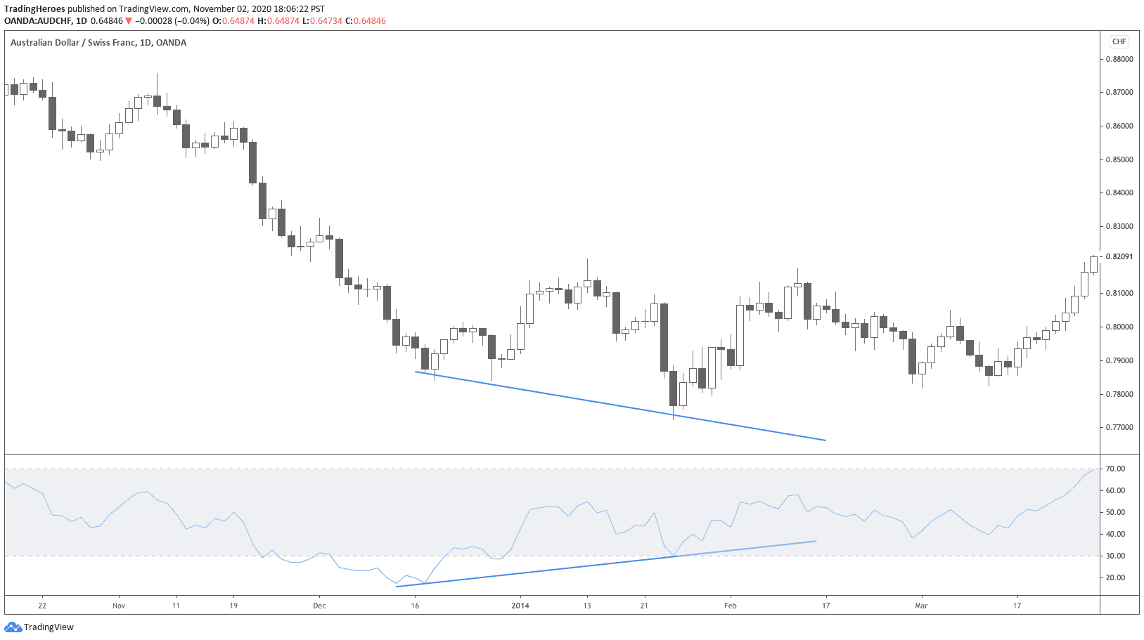 Затем ищите более низкий минимум цены и более высокий минимум RSI. Более высокий минимум RSI не обязательно должен находиться в области перепроданности, чтобы сигнал оставался действительным.